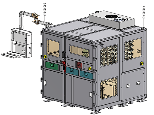 盟立集团开发的专用储存装置,可有效管理Solder Ball储存、取放。本体由抽屉、机械手臂以及两个旋转储存塔组成。抽屉投料口共两个,一个可容纳25个锡球罐,旋转储存塔共两座,为机台最后的存放区,一座可存放150个锡球罐,皆可根据使用者的需求做调整。
