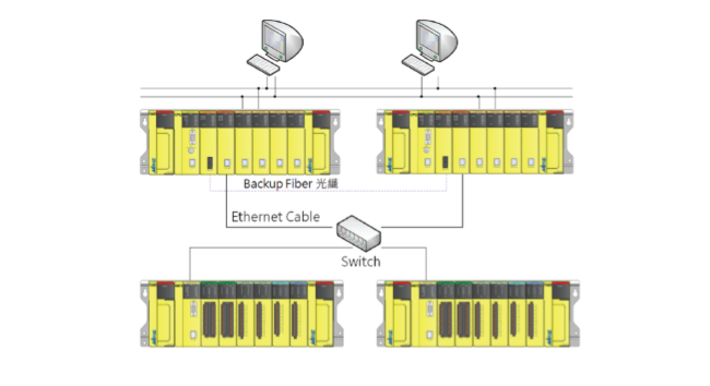盟立自动化复联式热备份控制器(Redundancy)FS-800系列,采热插入模块设计(Hot Swap),可灵活增加IO模块,其架构是由二组相同控制单元组合而成,每一组控制单元包含独立的主机(CPU)、内存、电源供应器、备援通讯等模块及机架。平时两组主机同时进行程序解题,但由主控主机完全控制I/O 模块,备援主机同时读取I/O 模块数据;当主控主机故障时,备援主机能实时自动切换为主控主机并取得I/O 模块控制权,维持系统无间断地继续正常运转,提供系统稳定为一高可靠度的复联式热备份控制器。